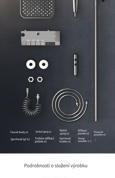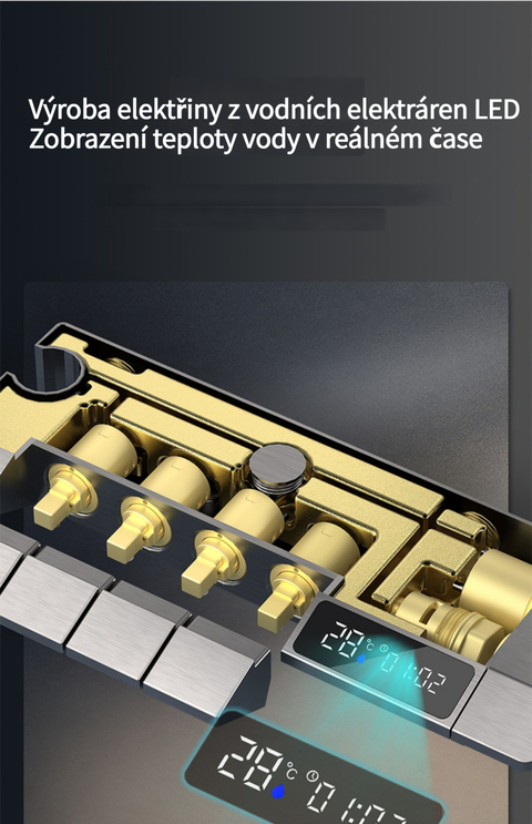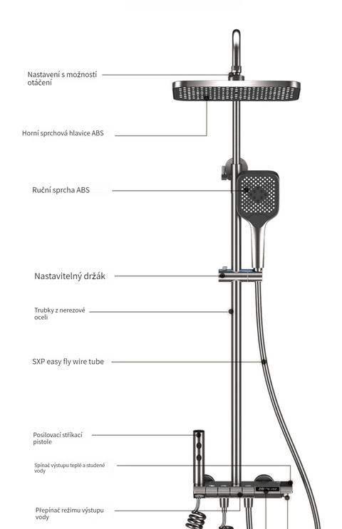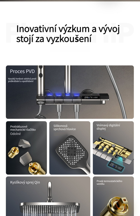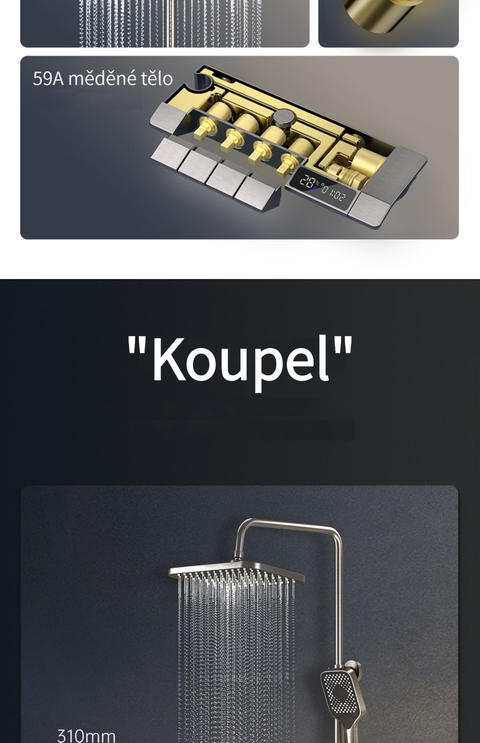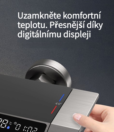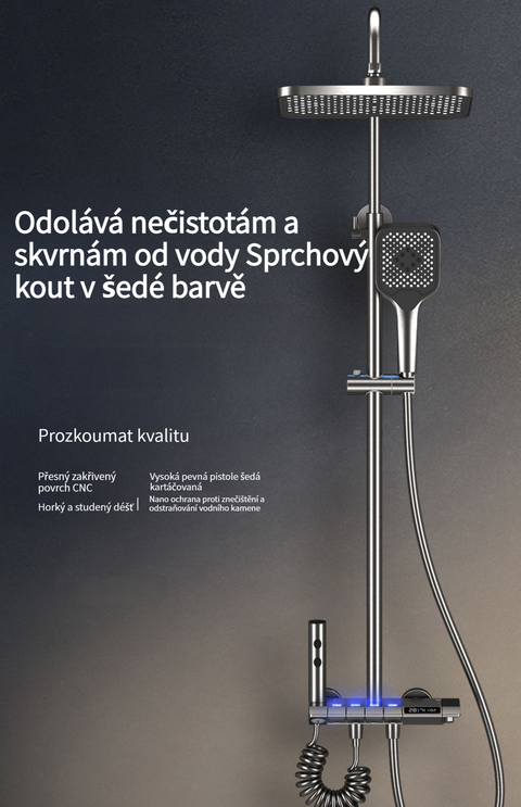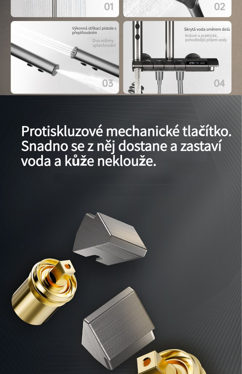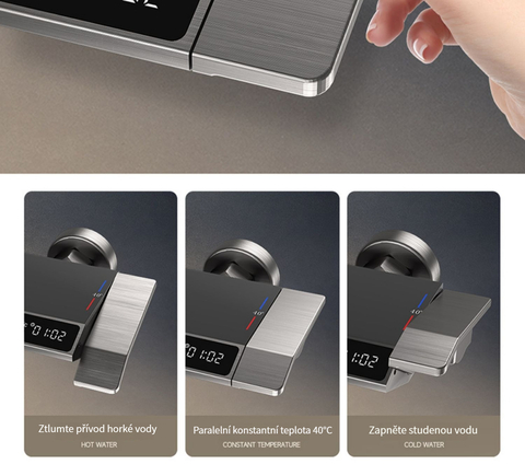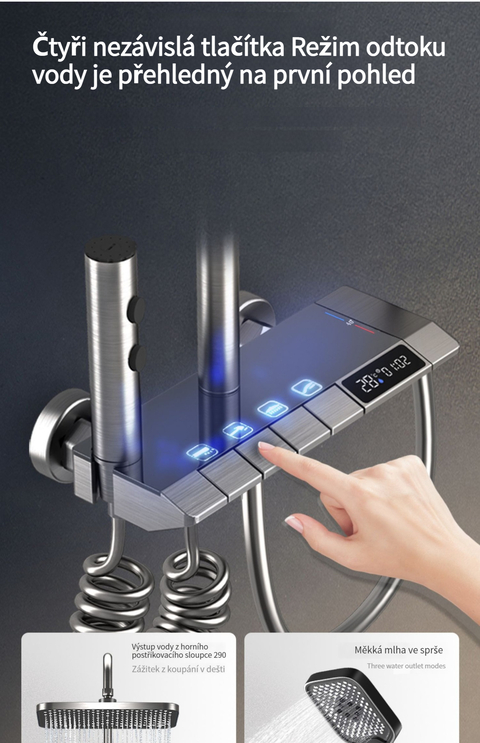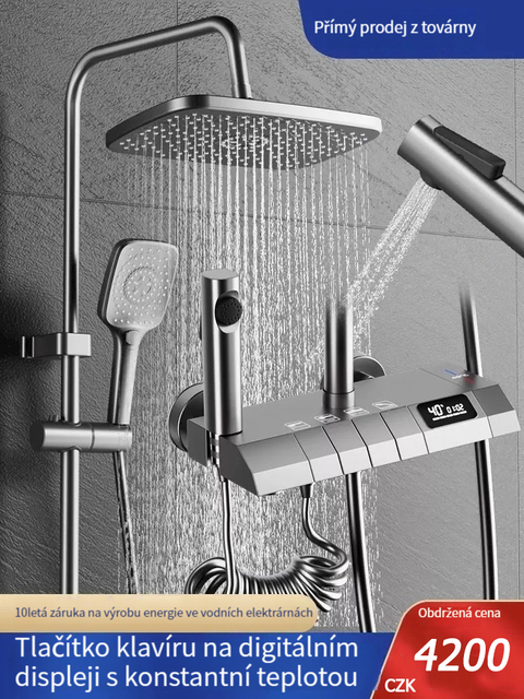 Multifunkční domácí sprchová souprava s klavírními tlačítky, digitálním ukazatelem teploty a rukojetí pro horkou a studenou vodu.
