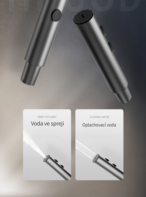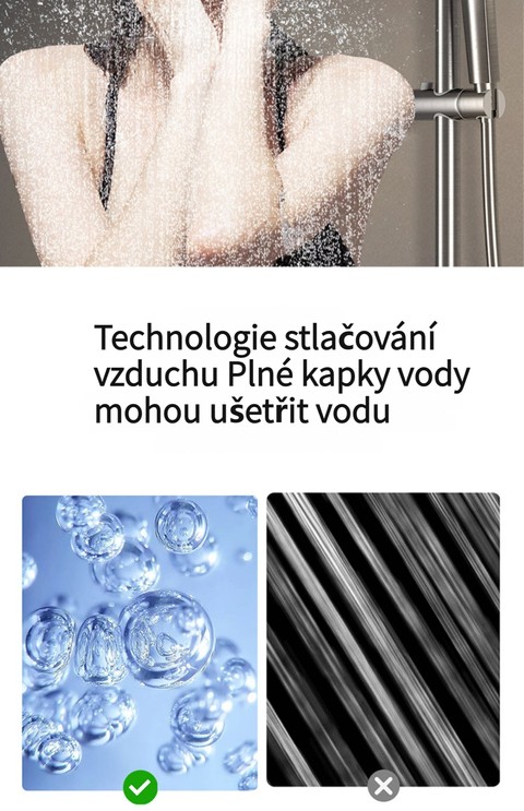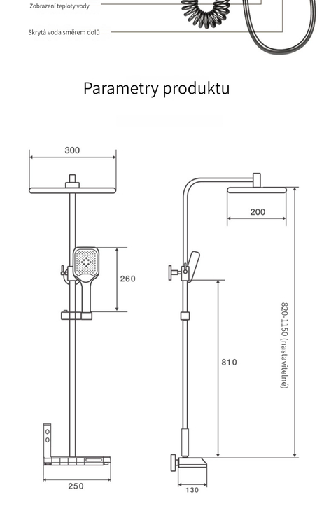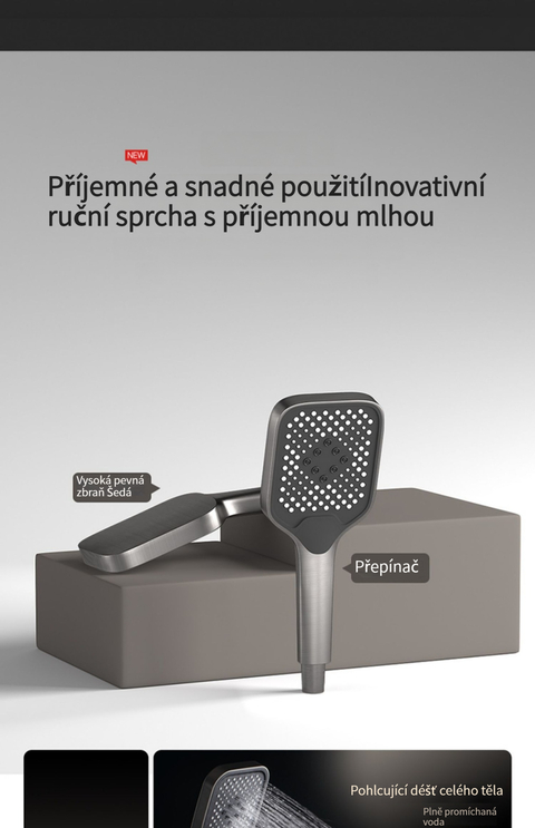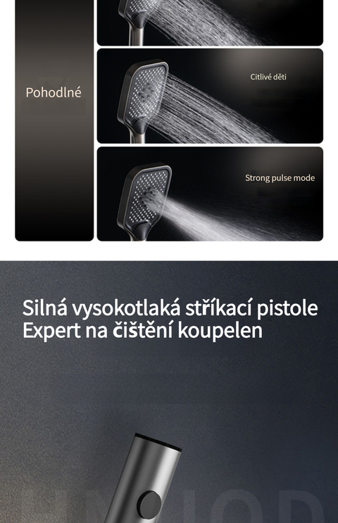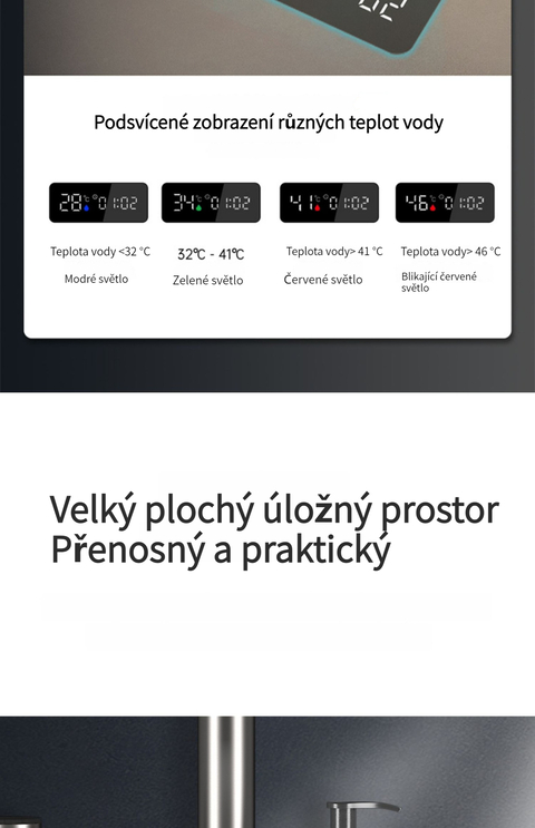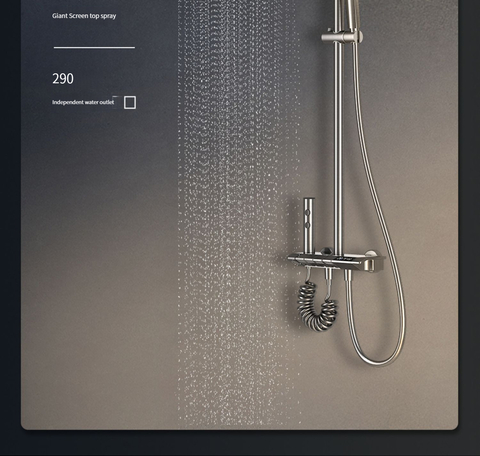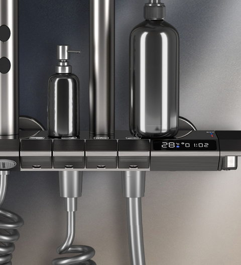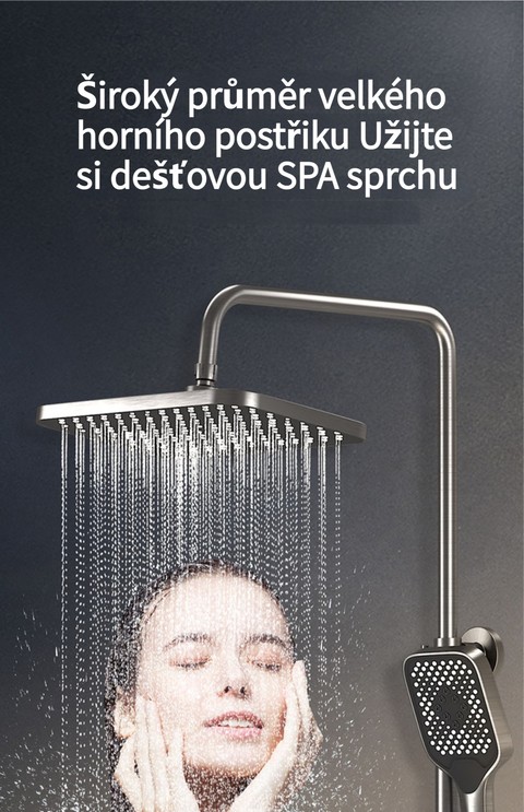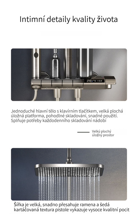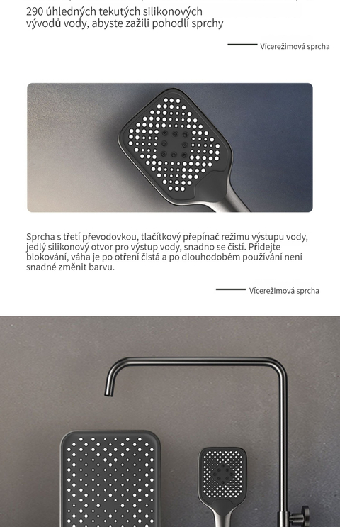 Multifunkční domácí sprchová souprava s klavírními tlačítky, digitálním ukazatelem teploty a rukojetí pro horkou a studenou vodu.